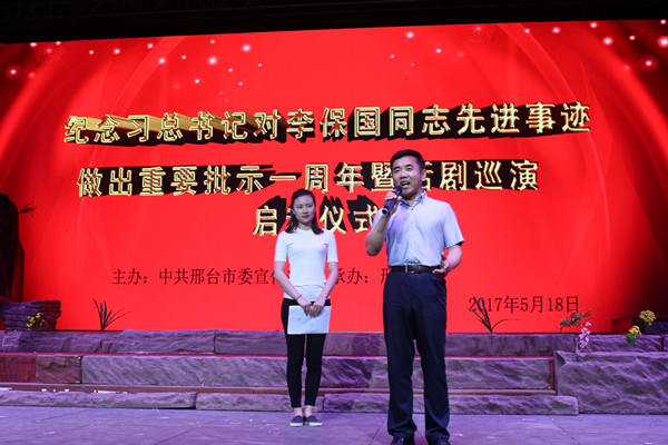 2017年5月18日晚,由邢台市委宣传部主办、我校承办的纪念习总书记对李保国同志先进事迹做出重要批示一周年暨话剧《李保国》巡演启动仪式在岗底村举行。校党委副书记赵建彬、岗底村党支部书记杨双牛、我校党委宣传部有关同志、岗底村及周边村民300多人观看了演出。