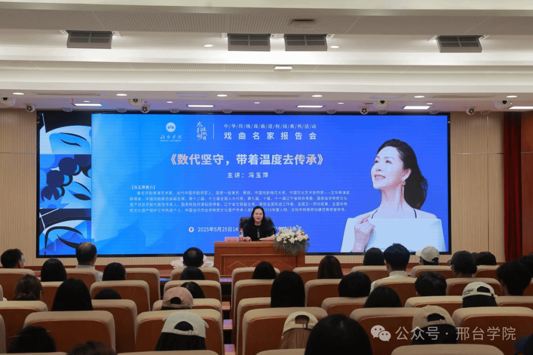 为使学生深入领会艺术前辈在成长历程中的心得感悟,5月25日下午,邢台学院特邀戏聚泉城·擂响中华“伶人王中王”戏曲名家巅峰汇评委、评剧表演艺术家冯玉萍女士作题为《数代坚守 带着温暖去传承》的专题报告。河北梆子表演艺术家刘薇薇出席,副校长刘永利参会并致辞,戏剧影视艺术系全体师生参加讲座。报告会由戏剧影视艺术系主任陈志良主持。